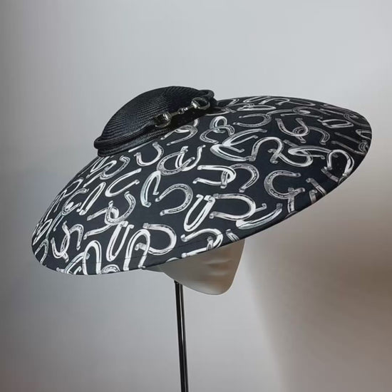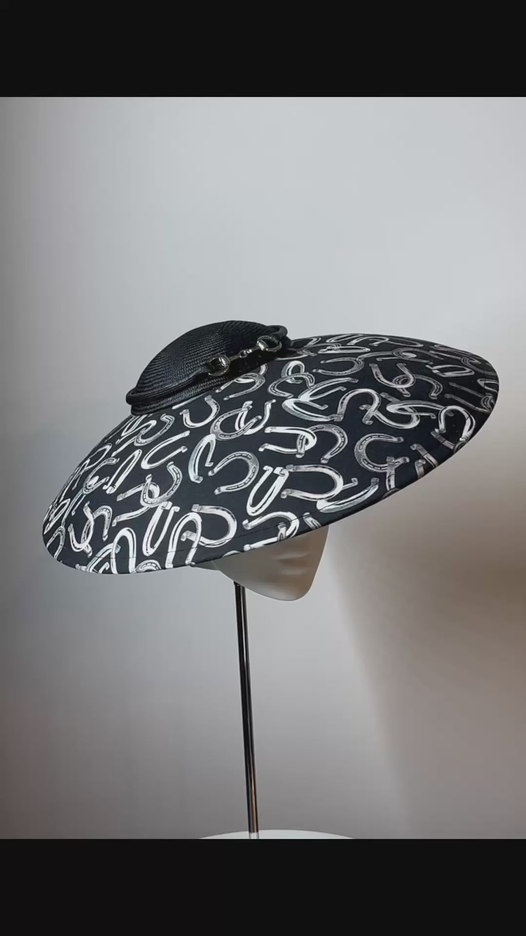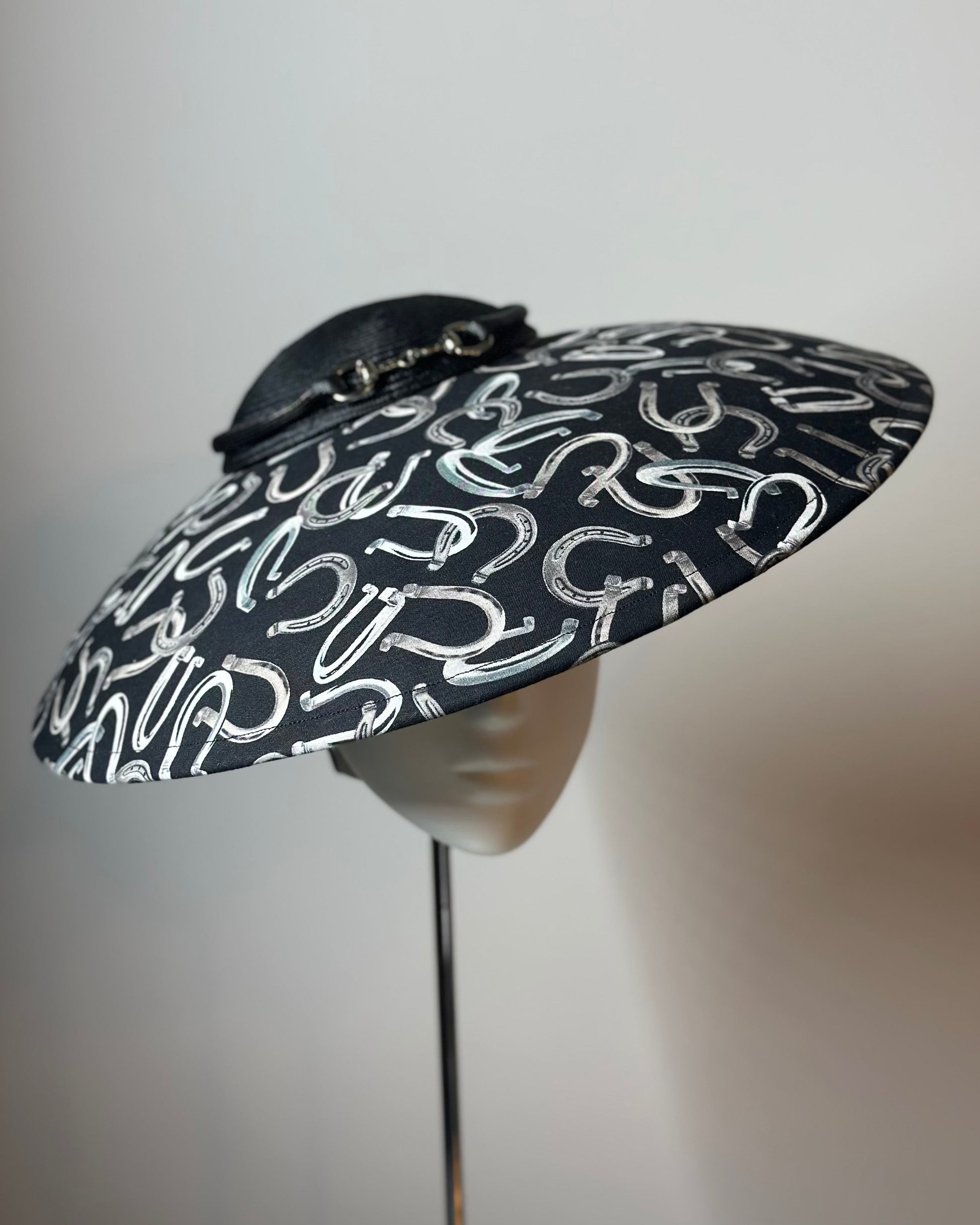 Crafted from sleek black straw, it’s boldly contrasted with black and white horseshoe fabric that shimmers with movement. A polished silver stirrup trim completes the look, striking the perfect balance between equestrian heritage and modern couture.