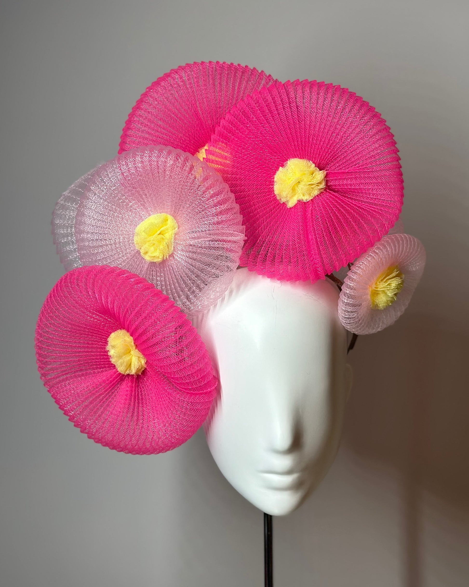 Pink Lotus – a breathtaking statement piece crafted from pleated crinoline, shaped into exquisite rounded flowers reminiscent of delicate lotus blooms. Cascading in varying shades of pink, this sculptural headpiece is both ethereal and bold, capturing attention from every angle.