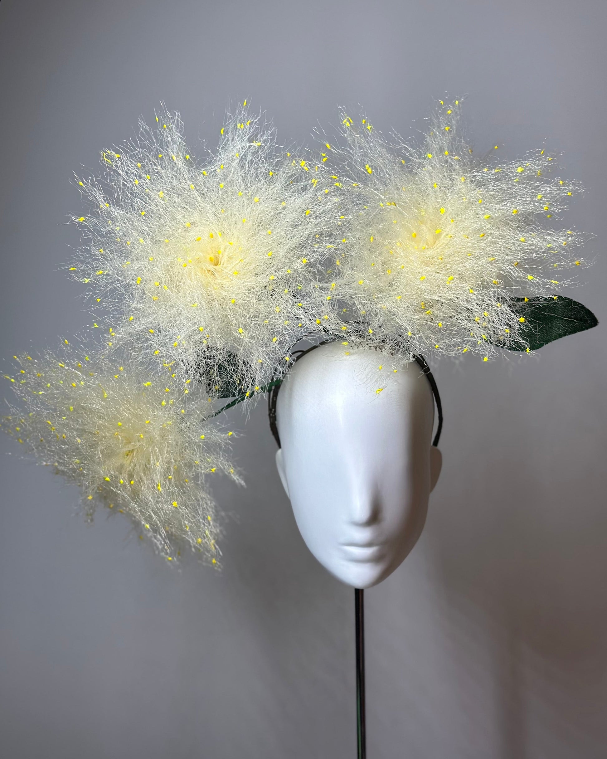 Ghost Gum – a refined tribute to Australia’s native flora, this striking headpiece features three sculptural cream flowering gums, handcrafted from airy crinoline. Their soft, ethereal petals are punctuated by bright yellow stamens, creating a luminous and delicate effect.