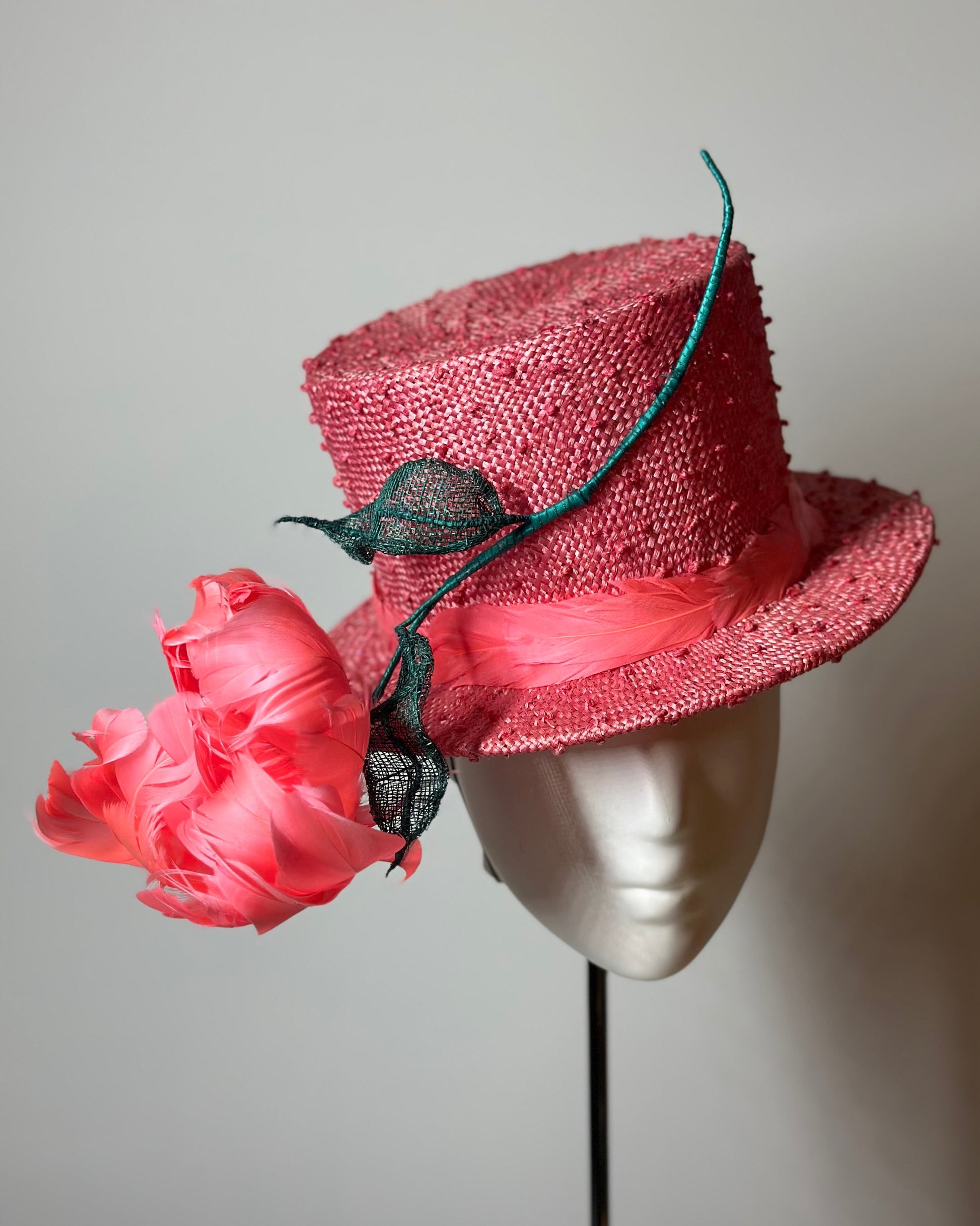 Crafted from intricately knotted straw, it features a bold coral feather rose in full bloom, framed by soft green sinamay leaves for a hint of contrast. A matching coral feather hat band wraps the crown, adding movement and texture with every turn.