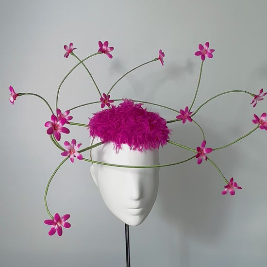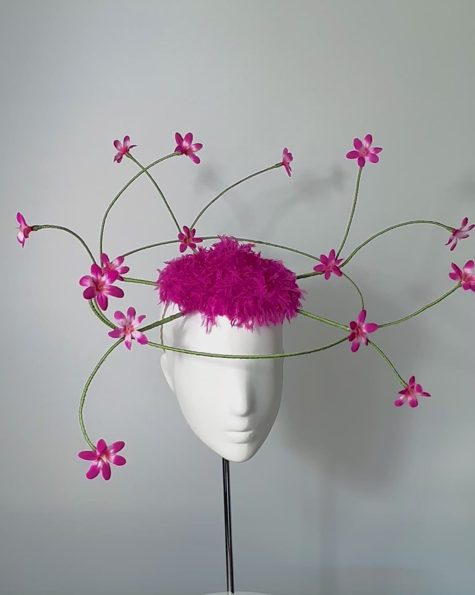 From the crown, fine embroidery-thread–wrapped wirework extends outward in soft, organic lines, creating a sense of lightness and movement around the head. Each strand is finished with the most delicate small pink flowers, adding a whimsical, floating quality that feels both botanical and couture-inspired.