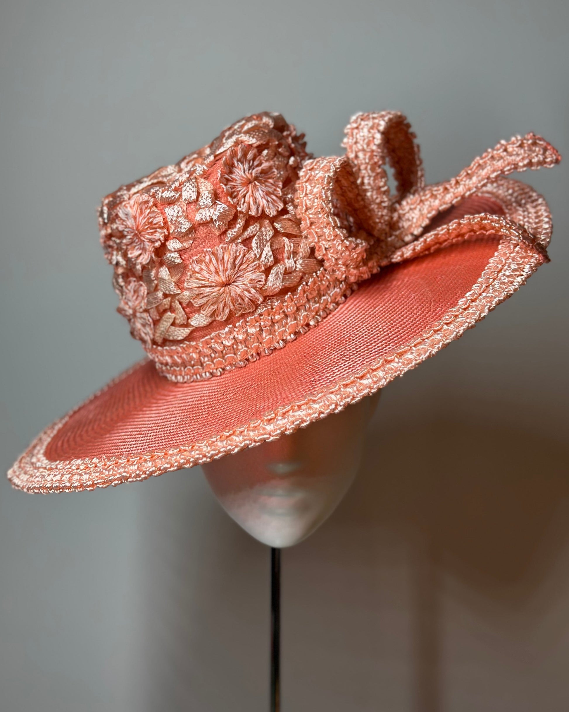 Blocked in a refined peach pink straw, the crown is wrapped in delicate vintage straw, its surface scattered with straw flowers that seem to have bloomed from another era. The wide brim and sculptural bow, crafted from vintage braid, add bold texture and a striking finish.