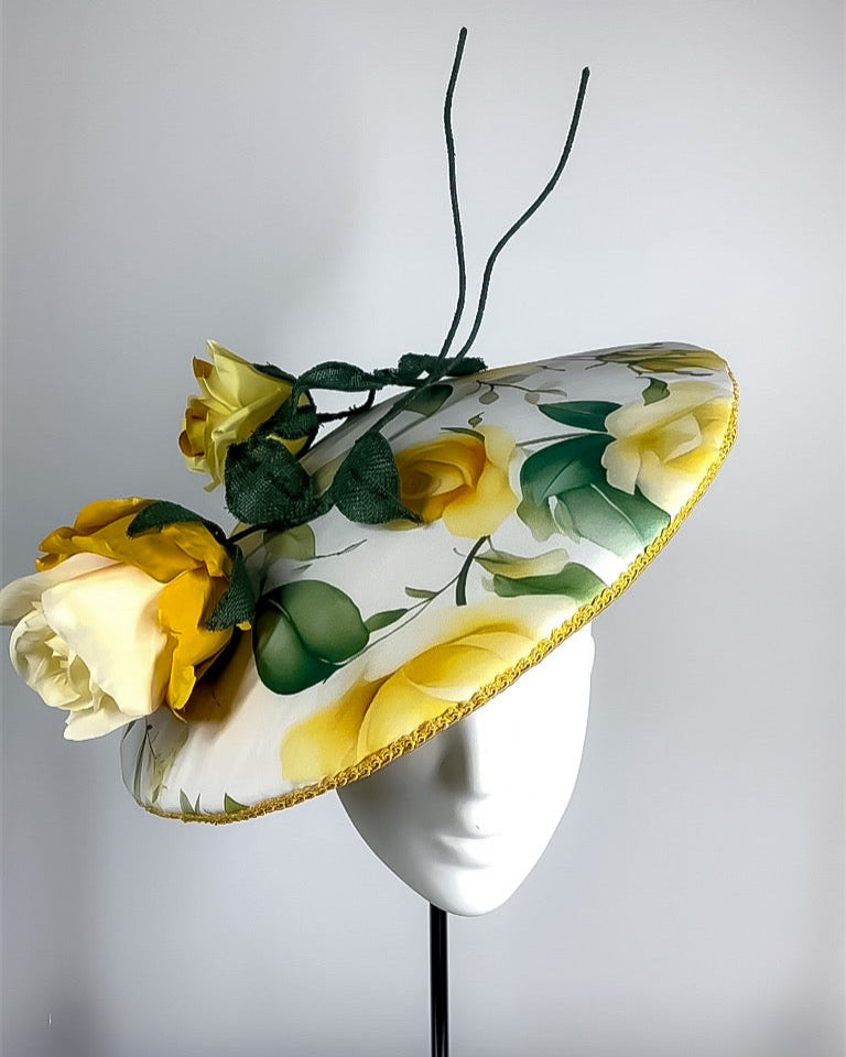 Primrose Picnic - light, lovely, and endlessly ladylike, Primrose Picnic is a sweetly structured saucer-style hat covered in cream fabric adorned with a delicate print of yellow roses and green leaves. Two handmade satin roses bloom across the crown in the same yellow tones, nestled among sculpted green sinamay leaves.