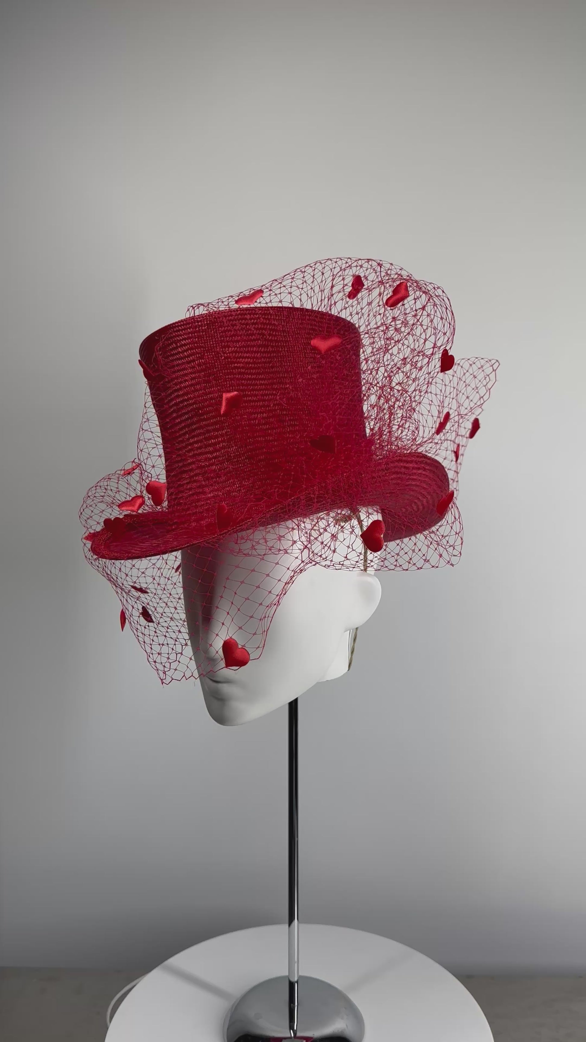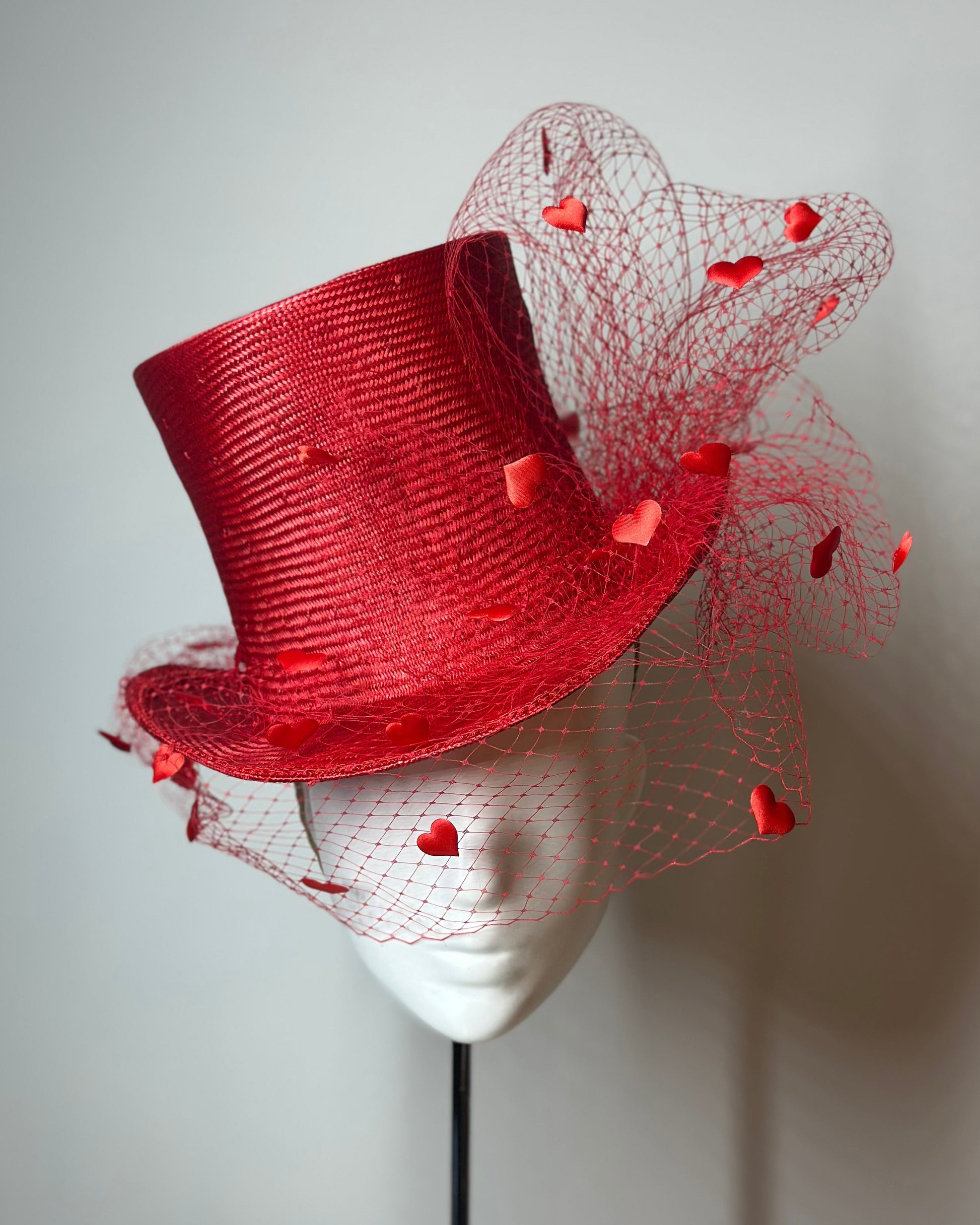 Heartbreaker - make a bold statement with this striking red straw top hat, beautifully enhanced with delicate netting featuring love heart motifs.